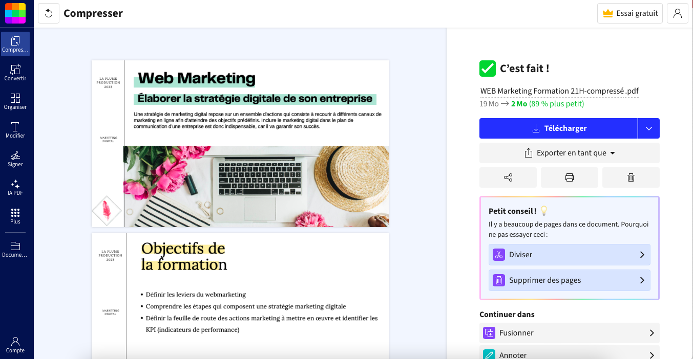 Une fois la compression terminée, l’écran affiche un message de confirmation clair indiquant que l’opération a réussi. Sur la partie droite de l’interface, vous voyez apparaître le nom du fichier compressé, accompagné de son nouveau poids. Dans cet exemple, le document passe de 19 Mo à 2 Mo, soit une réduction très significative.
