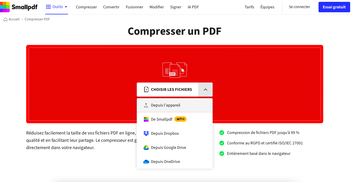 Ouvrez votre navigateur et rendez-vous sur un outil proposant une fonctionnalité dédiée à la compression PDF. Prenons ici Small PDF. Une fois sur la page de compression, vous voyez une interface volontairement épurée. Au centre de l’écran, une zone vous invite clairement à importer un fichier PDF. Aucune autre option parasite, vous êtes exactement au bon endroit.