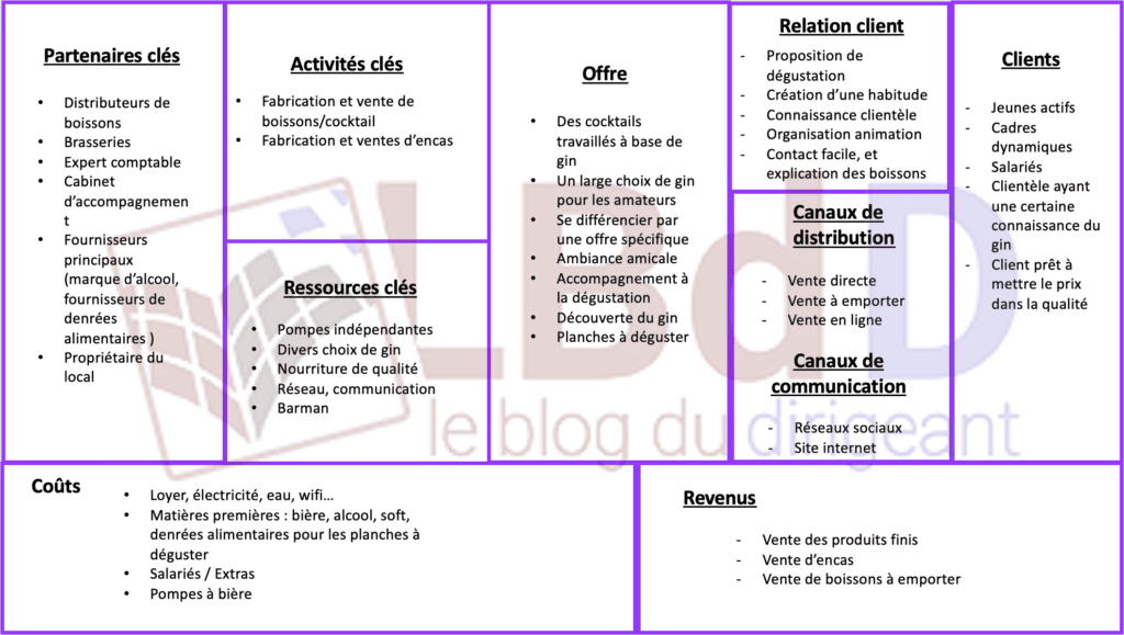 Le business model Canvas permet de représenter en une page l’intégralité du modèle économique d’une entreprise. Afin de vous aiguiller au mieux dans la création de votre propre bar, nous avons réalisé un Business Model Canvas basé sur l’activité du bar interrogé.