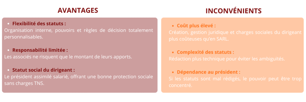- Un statut social protection pour le dirigeant, en tant qu’assimilé -salarié (à contrario de la SARL qui confère le statut TNS).