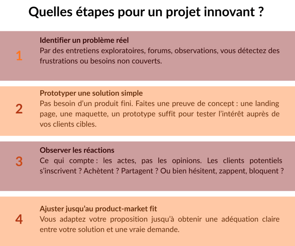 Dans ce cas, l’objectif n’est pas de quantifier une opportunité, mais de valider un besoin, tester une solution, observer les réactions, et ajuster. C’est une approche exploratoire, souvent issue du Lean Startup ou du design de l’expérience utilisateur.