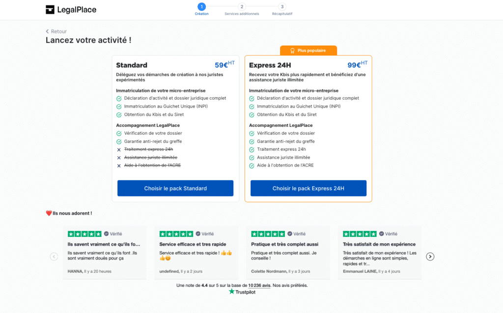 Une fois ces premières questions remplies, il est temps de sélectionner l’offre Legalplace qui correspond le mieux à vos besoins pour créer votre micro entreprise.