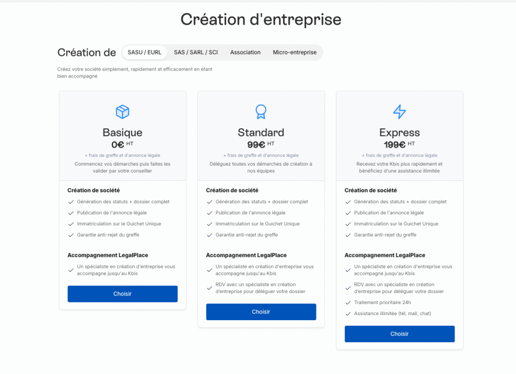 LegalPlace possède 3 offres au sujet de la création d’entreprise :