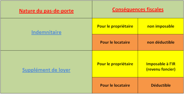 La perception d’un tel pas-de-porte est assimilée à un revenu foncier imposable à l’impôt sur le revenu.Le propriétaire pourra bénéficier, sous conditions, d’une imposition étalée dans le temps (4 ans).